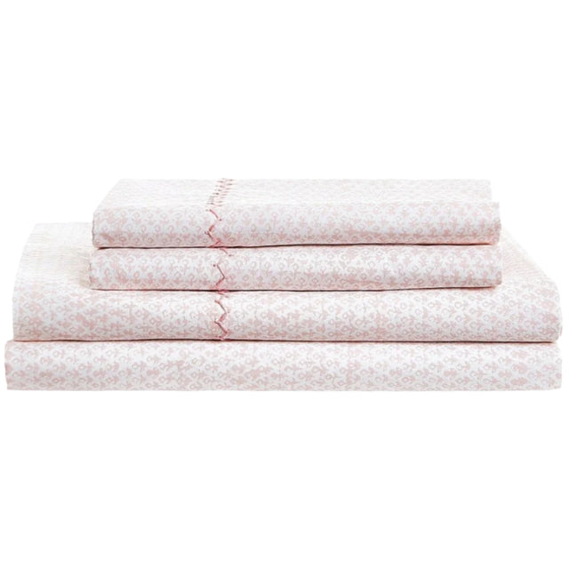 Poseti Lotus Organic Cotton Sheet Set by John Robshaw. Crisp white cotton percale bedsheets and pillowcases featuring a subtle light pink pattern printed with a unique distressed effect. This soft colored bedding is versatile and perfect for layering–go bold and mix it with other patterns and colors or opt for white and neutrals for a muted look.