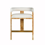 Cruise Burl Wood Accent Counter Stool by Worlds Away. This contemporary and elegant counter height stool is sure to make a statement in any space. The counter stool features a hardwood tri-leg frame with a matte burl veneer finish, barrel back and t-stretcher. The chair has crisp and tailored white linen upholstery and brass ferrule hardware.
