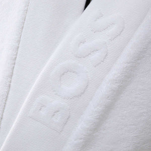 This Plain Ice Bathrobe by Hugo Boss is contemporary, stylish and luxuriously cozy. The white bathrobe is made from supremely soft and plush twisted Egyptian cotton. It features a classic kimono-style collar with a BOSS logo woven in a contrasting texture. The sumptuous terry cotton robe is designed with two large patch pockets and a matching belt.