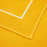 Yves Delorme Croisiere Riviera Beach Towel with Blanc embroidery. Whether you're relaxing by the pool or splashing and sun bathing at the beach, Yves Delorme offers the perfect beach towel for any summer activity. Croisiére Riviera is the brightest happiest yellow to match the color of sunshine. This Yves Delorme Beach Towel comes in a solid color and is finished with a contrasting white bourdon stitch. Fits a standard deckchair. Perfect for beach and summertime fun.