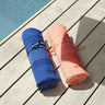 Cap Code Beach Towels by Hugo Boss–these modern and luxurious beach towels are sure to keep you stylish as you enjoy a day in sun. The fouta Turkish beach towels feature a subtle pattern with horizontal stripes stitched on the ends. They are finished with short fringe and have a "BOSS" logo embroidery. The towels reverse to terry on the back and come with a handy closing belt.