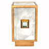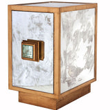 Worlds Away Savannah Gold & Antique Mirror Cabinet. This one door cabinet features an antique mirror overlaid with hand-applied gold leaf and gold border. It includes a single fixed interior shelf and a Greek key base detail. Functional and glamorous, this side table is perfect for today's modern luxurious interiors.