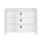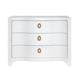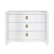 Cora White Chest by Worlds Away features a curved front design with three drawers and textured linen finish. Decorative satin brass ring hardware and soft close glides add a touch of sophistication, making it suitable for any entryway, bedroom, or bedside to store keys, papers, and more.