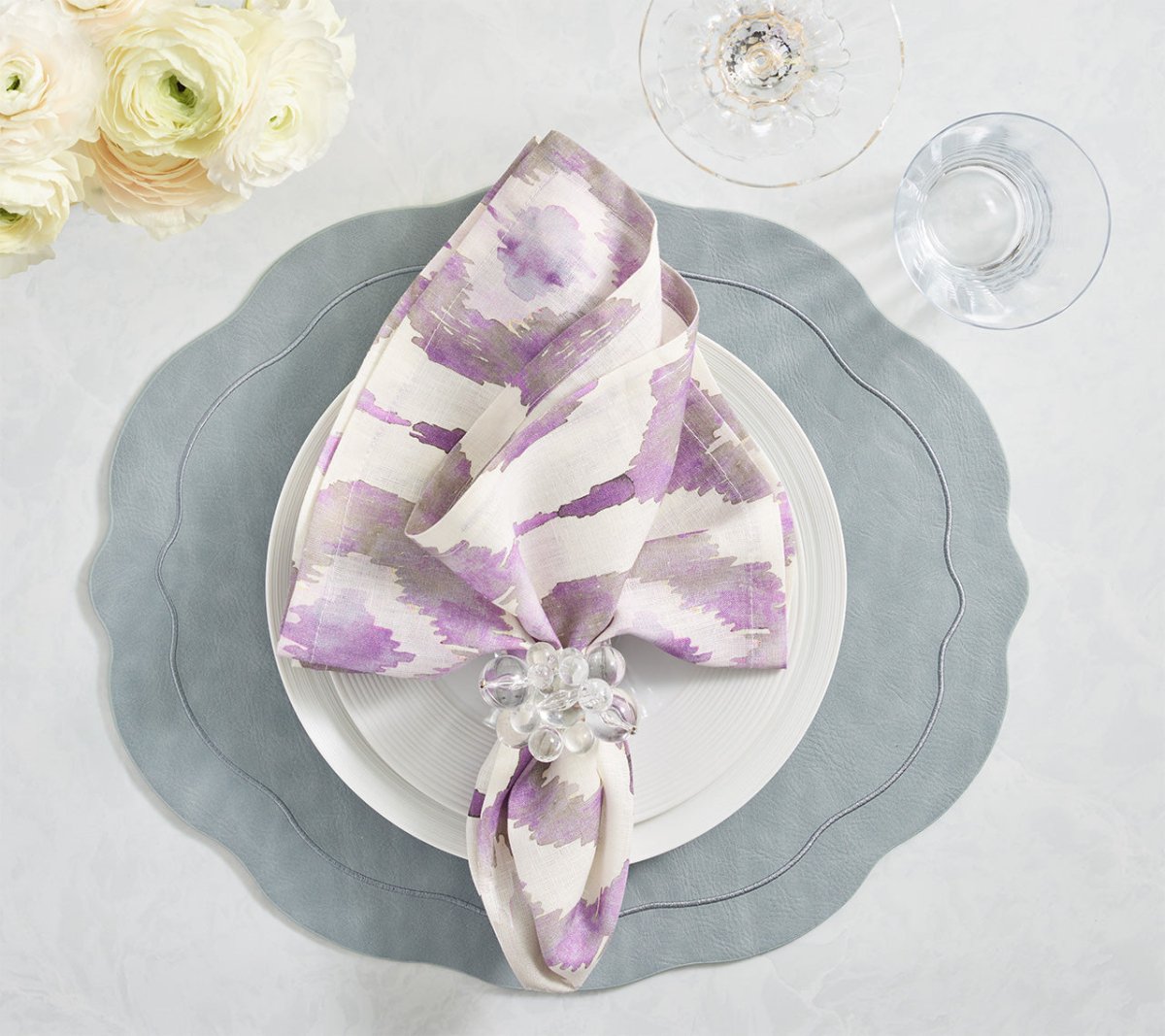 Tailored Placemat in Steel Gray by Kim Seybert. The traditional oval shape gets a modern refresh with the matte faux leather steel gray Tailored Placemat. A stylish wavy edge and embroidered tone-on-tone border detailing elevate this faux leather accessory. This hard-backed, versatile placemat is available in a variety of colors. The subtle gray variation is suitable for various entertaining themes, whether it's bridal showers, casual dinners, or anything in between. This versatile placemat effortlessly adapts to both dressed-up and more laid-back settings. Materials: 100% Polyurethane with PVC Backing. Care: Wipe clean with a damp cloth.