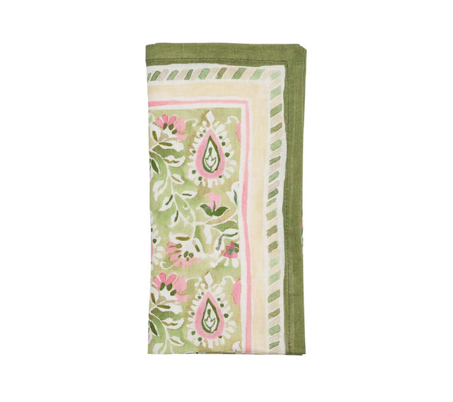 Mira Napkin in Green & Pink Set of 4 by Kim Seybert. The vibrant Mira napkin is adorned with a hand-painted paisley pattern that has been digitally printed on luxurious linen. Neutral vines interlace over a soft green backdrop, punctuated by pops of bright pinks and deep greens. Whether it's a garden party or a bridal shower, this breezy napkin brings a breath of fresh air to any occasion. Complete this look with the coordinating Mira tablecloth. Materials: 100% Linen