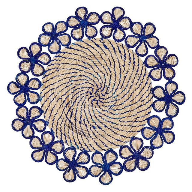 Mode Living Lanai Placemat Navy. Adorned with flowers and available in a variety of tropical colors, the Lanai placemats transport you to the islands of Hawaii. Their handcrafted design adds texture and vibrancy to any summer table. Handmade, Iraca Palm, Raffia.