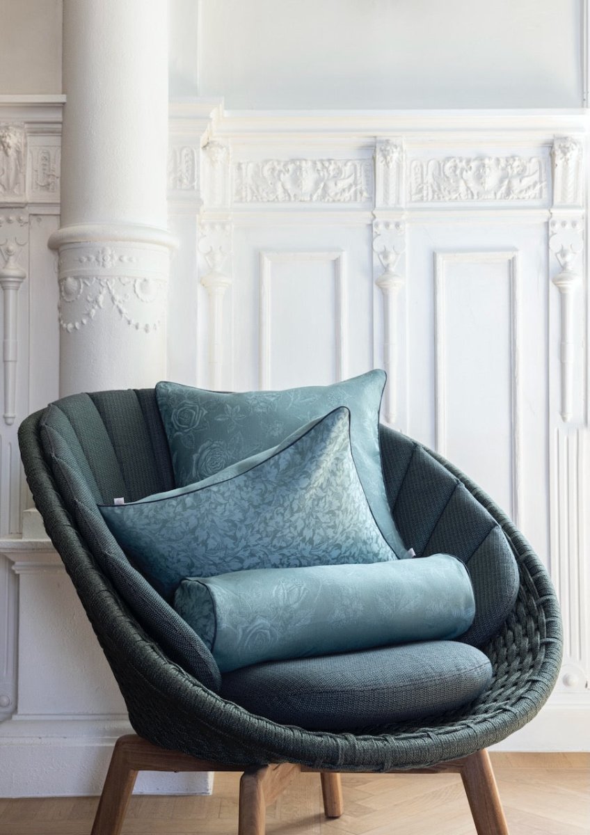 Romance Green Cushion Cover By Le Jacquard Francais. Step into a family home where a gentle, cozy atmosphere reigns. Heirloom roses, garden flowers, and boxwood foliage create a romantic English-style setting, perfect for moments of sharing and serenity.
