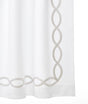 Modern and sophisticated, this Leigh Shower Curtain by Legacy Home will delight in any interior. The shower curtain is available in White and Ivory Diamond Pique–it features a design with appliquéd sateen tape elegantly intertwining in a U-shape. Custom made to order with over 50 sateen tape colors to choose from.