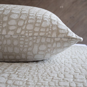 This gorgeous and fashion-forward Croc Quartz Bedding by Ann Gish makes a bold statement in any modern luxury bedroom. The coverlet and shams feature a design inspired by crocodile skin leather handbags. The pattern is jacquard woven in beautiful neutrals with a unique texture that gives the bed linens an elegant and impactful look. Coordinating Large Euro Pillow also available.
