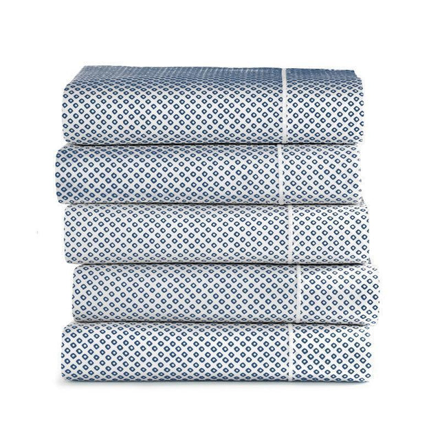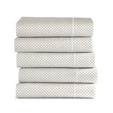 Emma Sheet Sets by Peacock Alley. Printed with a small geometric diamond. 100% long-staple cotton sateen, 300 Thread Count. Finished with a Satin Stitch Detail on Flat Sheets and Pillowcases. Luxury Bedding Imported from Portugal.