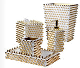 Modish and glamorous, the Quill White and Gold Bath Accessories by Mike + Ally make a bold statement in any interior. The unique luxury bath accessories feature gold spikes embedded in white enamel. This collection is sure to stand out in any modern bathroom.