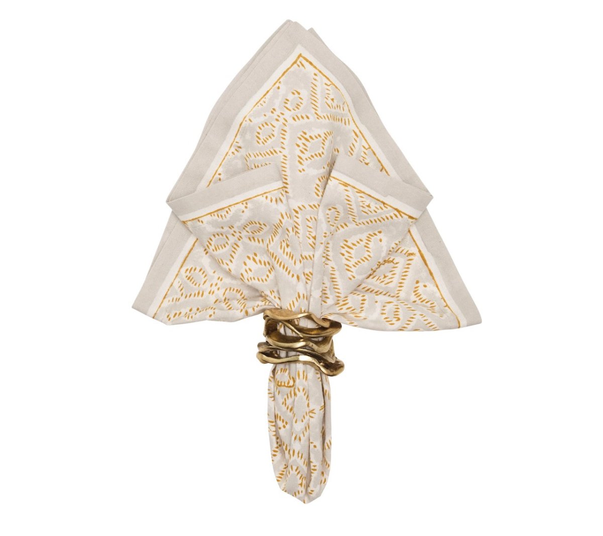 Alfresco Napkin in Natural & Gray by Kim Seybert. The Alfresco Napkin checks all the boxes of open-air entertaining elegance. Handcrafted with traditional Indian block printing, these fine cotton napkins dress up casual brunches and bring extra zest to elevated evenings. A must-have for this season, you'll want this set in every color. Materials: 100% Cotton. Care: Do not dry clean. Machine wash cold with like colors on gentle cycle with mild detergent. Machine dry low and remove promptly. Steam iron while damp on reverse side. Do not bleach.