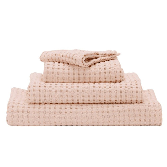 Abyss Pousada Waffle Towels Nude 610. Crafted in Portugal from 100% Giza Cotton the Abyss Towels in Nude are a beige neutral color with the slightest hint of pink undertone. Soft, supple and absorbent waffle texture. Modern and fresh, beautifully drapey and finished with a simple finish. Color coordinates with other styles in the Abyss Habidecor color palette of the season. Wonderful and quick-dry style in Bath Towels, Hand Towels, Wash Cloths and European Sizes, too.