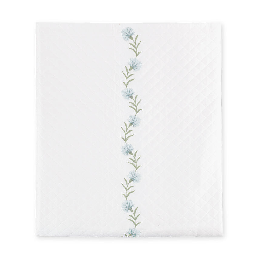Matouk Daphne Matelassé in Bluebell. Daphne Coverlet is an embroidered blue floral vine on classic diamond matelasse pattern. Timeless, special, opulent. Textured matelassé finished with iridescence for an elevated look. Your bed cover has never looked better! Pair this lovely bedspread with Daphne Sheets and Duvet for a 100% Coordinated Look.