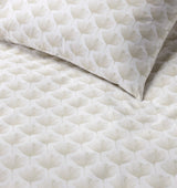 Edna Bedding by Sferra. Printed on Italian-woven long-staple cotton, in striking colors, Edna is an ode to vivid extravagance. The reversible design offers two distinct expressions of artistry. On one side, a repeat gingko leaf pattern, symbolizing beauty and enduring quality with its graceful form. On the other, a minimalist art deco texture unfolds, kaleidoscopic in its mesmerizing symmetry.