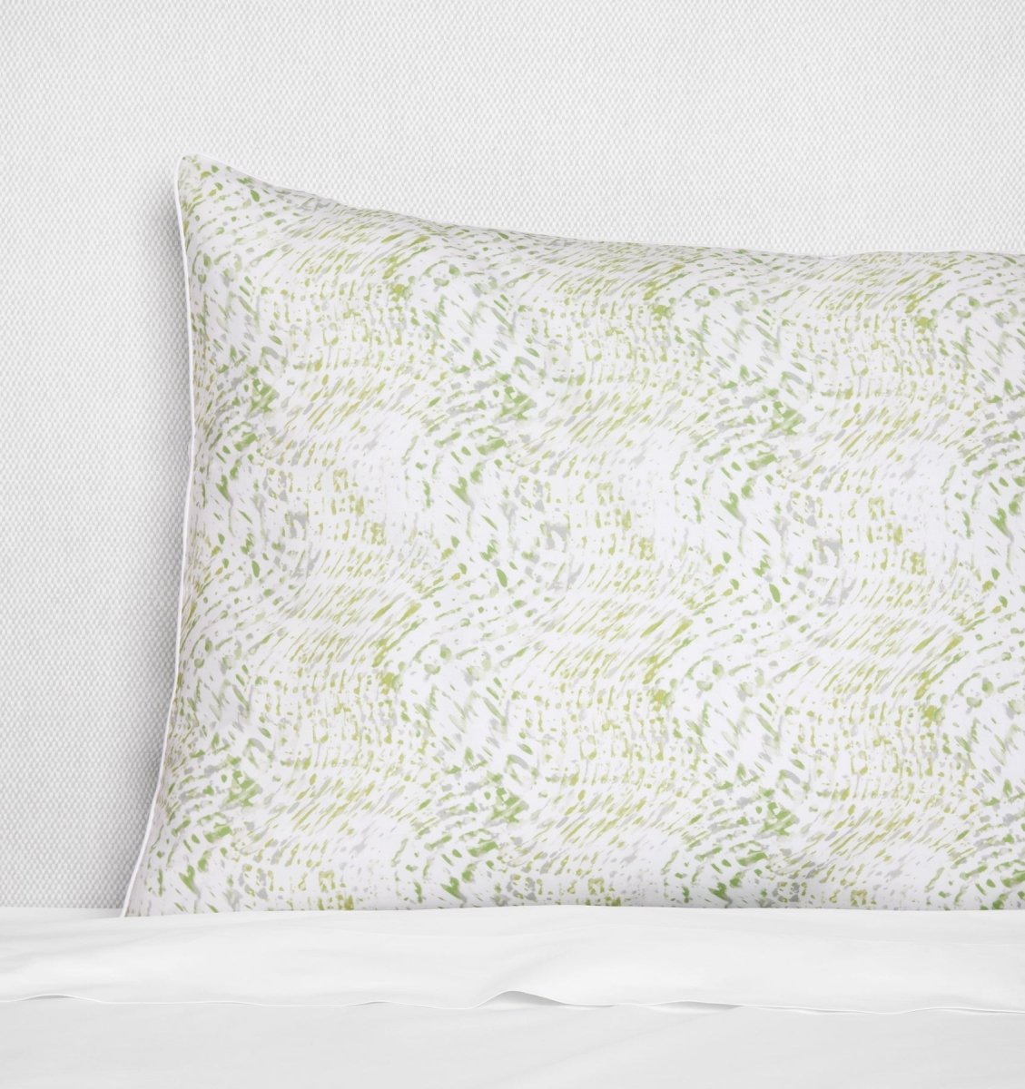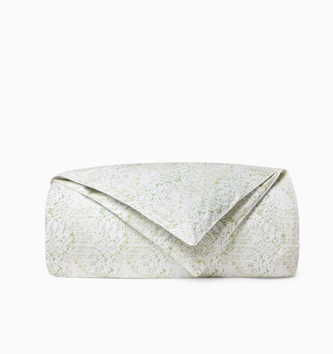 Meloria Bedding by Sferra. Meloria captures the organic beauty of stone and water through its distinctive printed percale. Available in fresh shades of green and blue, this Italian-woven collection features an all-over tactile pattern on the duvet and shams, with a coordinating printed border appliqué on the duvet reverse—a thoughtful design that brings mineral-inspired texture to the bed.