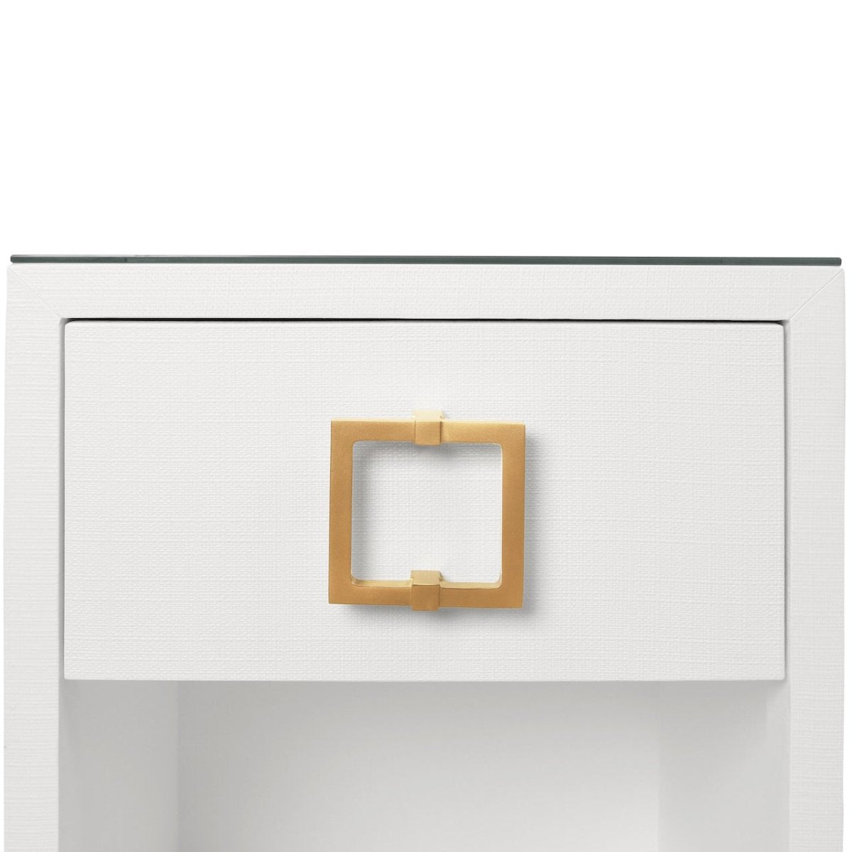 Worlds Away Blair White Side Table. One Drawer Side Table With Large Brass Square Hardware In White Textured Linen With Glass Top. Dimensions 29"H x 18"W x 18"D. Made in VIETNAM