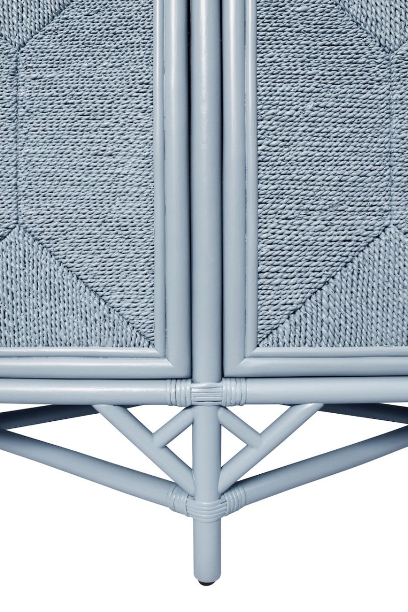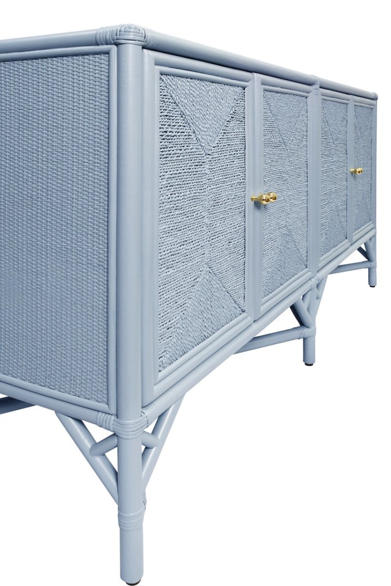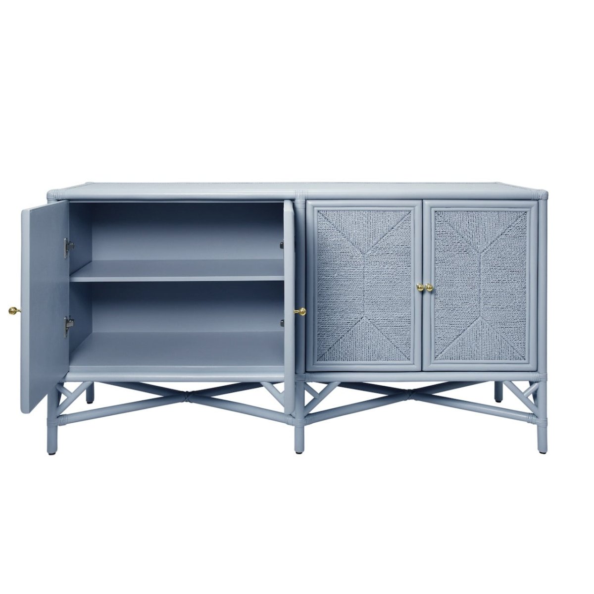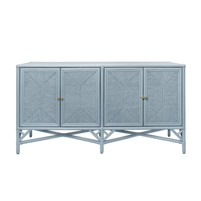 Worlds Away Eleanor Light Blue Buffet. Rattan Four Door Cabinet With Rope Front Doors In Painted Light Blue. Dimensions 33.25"H x 60"W x 18.25"D.