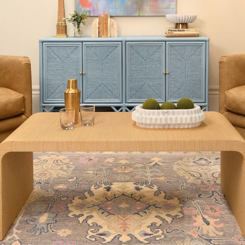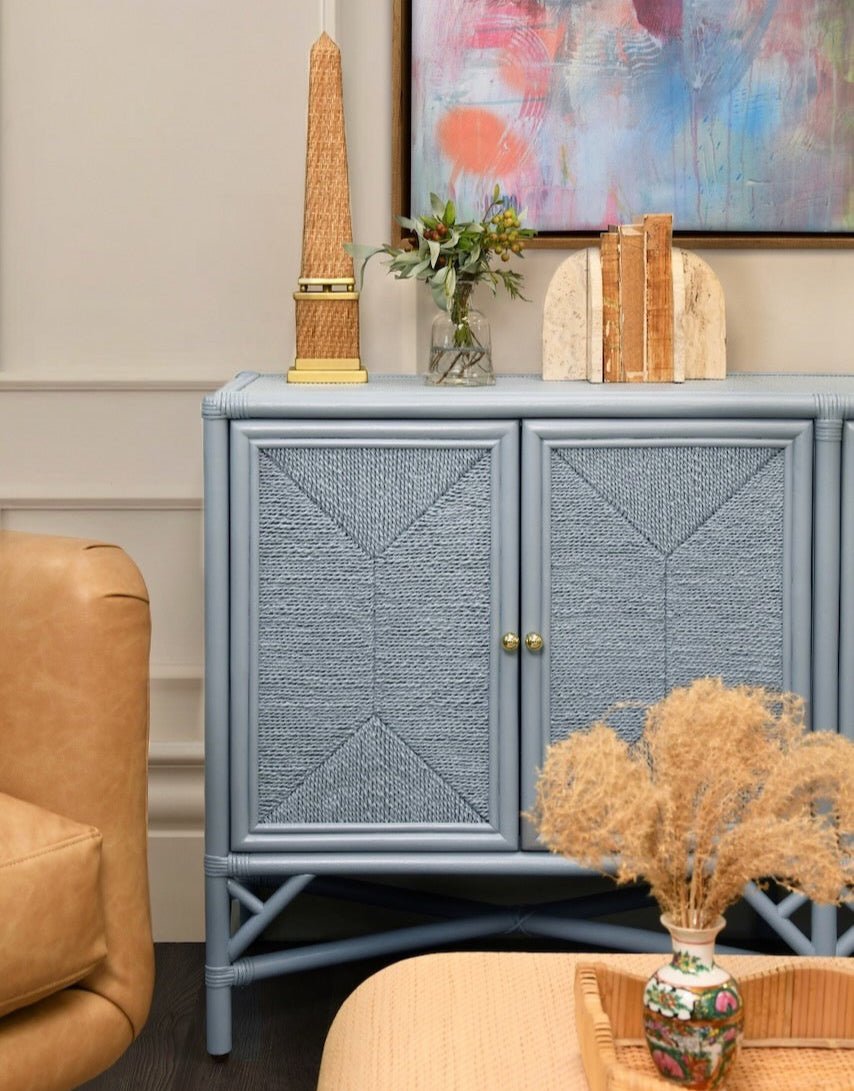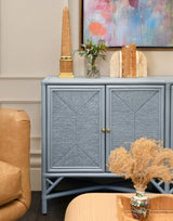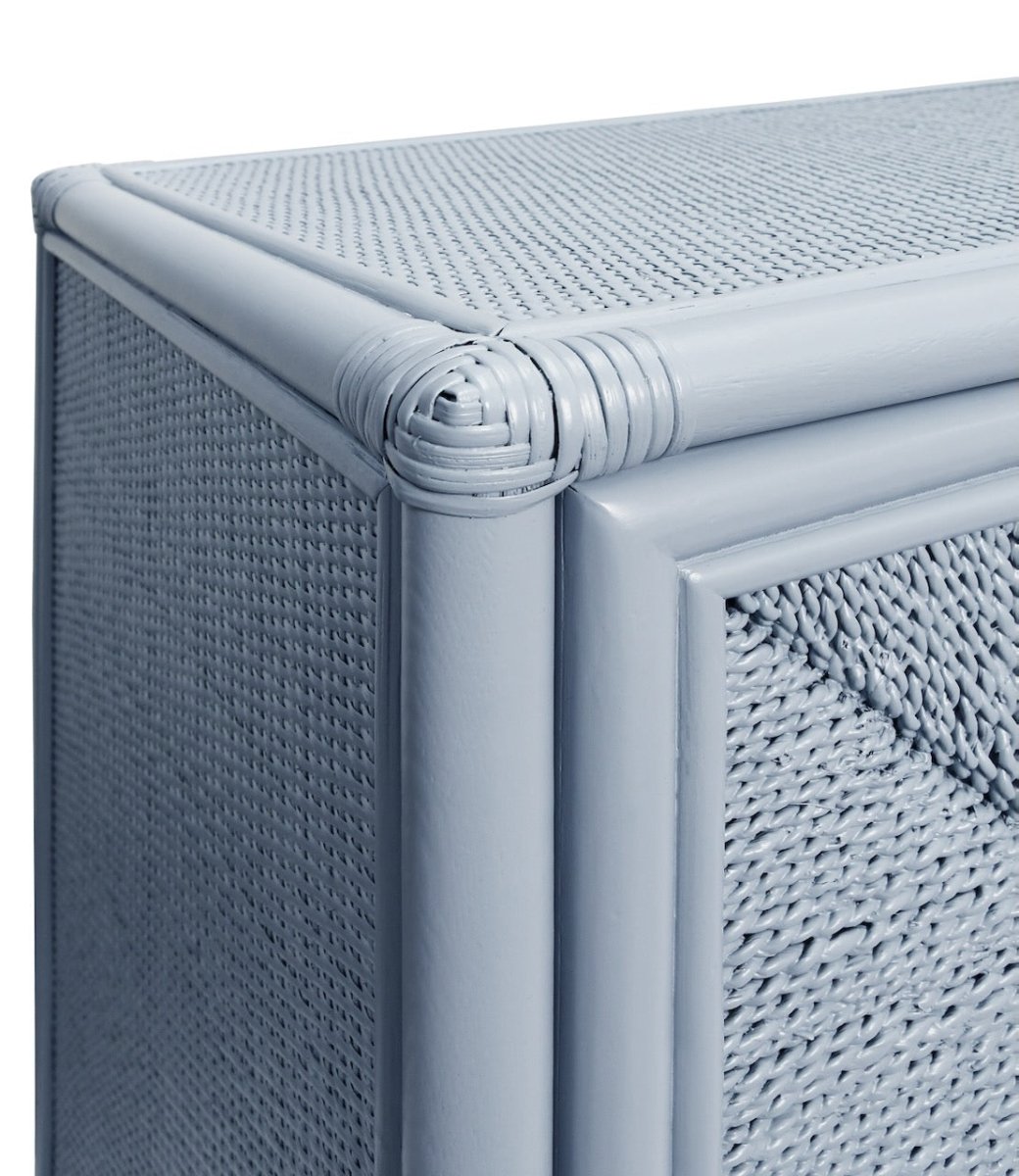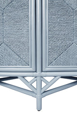 Worlds Away Eleanor Light Blue Buffet. Rattan Four Door Cabinet With Rope Front Doors In Painted Light Blue. Dimensions 33.25"H x 60"W x 18.25"D.