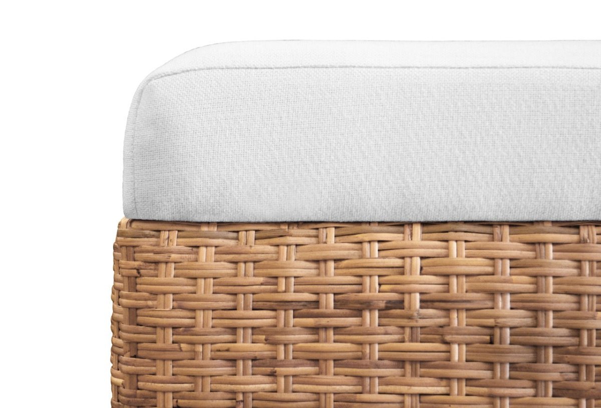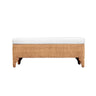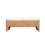 Worlds Away Maldives Bench. Bench In Woven Water Hyacinth With Performance Ivory Linen Fabric. Dimensions 21"H x 49.5"W x 18"D. Made in Indonesia. Bring natural warmth and casual elegance into your space with the Maldives Bench by Worlds Away. Handwoven from water hyacinth and topped with a plush performance ivory linen cushion, this bench blends artisanal texture with everyday functionality.