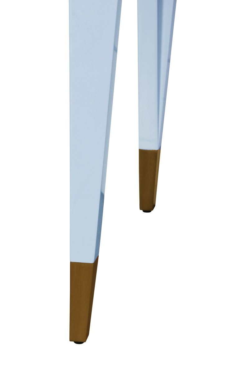 Worlds Away Mandi Light Blue Desk. Tapered Leg Desk with luxurious and special Antique Brass-Finish Foot Caps. The single drawer is perfect for storing pens, paperclips, papers and anything you'd like to hide away from view. Beautifully Glossy Light Blue Lacquer Desk is at once Sturdy and Feminine.