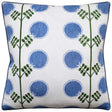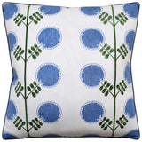 Ryan Studio Artha Sapphire Decorative Throw Pillows. Embroidery on an abstract Floral with a Global vibe. Large scale linear design. These throw pillows have a gentle stripe effect bordered by leaves & otherworldly botanicals. Beautifully crafted for use in a bedroom or as a sofa pillow or chair cushion. You'll love the color story of soft white, blue and green on the front reversing to a solid.