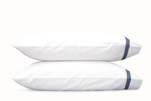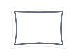 Lowell Steel Blue Bedding by Matouk. Enjoy luxury comfort with the Lowell Steel Blue Bedding by Matouk. Made with luxurious Milano percale, this bedding features a soft finish that's perfect for sleeping in the heigh of comfort. It's sure to be a cozy addition to any bedroom. Lowell is Matouk's iconic, best selling style. Elegant and modern in White with Steel-toned Trim. Percale sheeting lavishly woven in Italy from the finest Egyptian cotton, finished with a distinctive 1-inch trim.