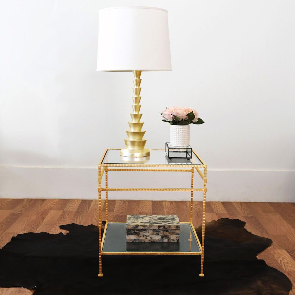 Amos Gold Two Tier Square Table by Worlds Away showcases a modern and sophisticated design that will seamlessly complement a number of luxury interiors. The table has a hand-hammered iron frame with a gold leaf finish, and features two beveled glass shelves.