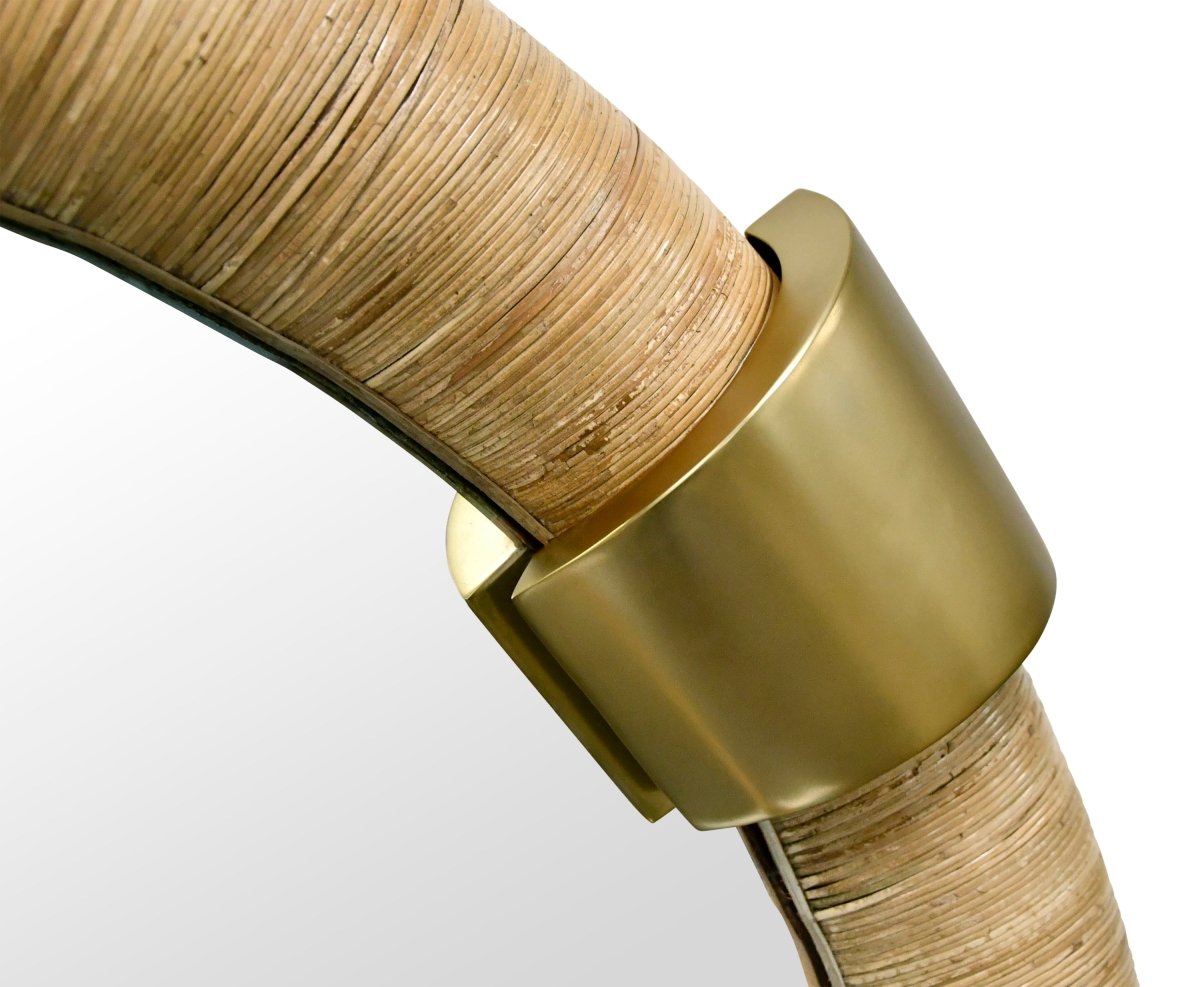 Worlds Away Saylor Round Wrapped Rattan Mirror With Brass Detail. Gorgeous Wall Mirror with Brass-Finish Metallic Accents. Part of the beauty? Rattan has natural variations and may differ slightly from section to section. This creates a timeless, rich look that you'll love for years.