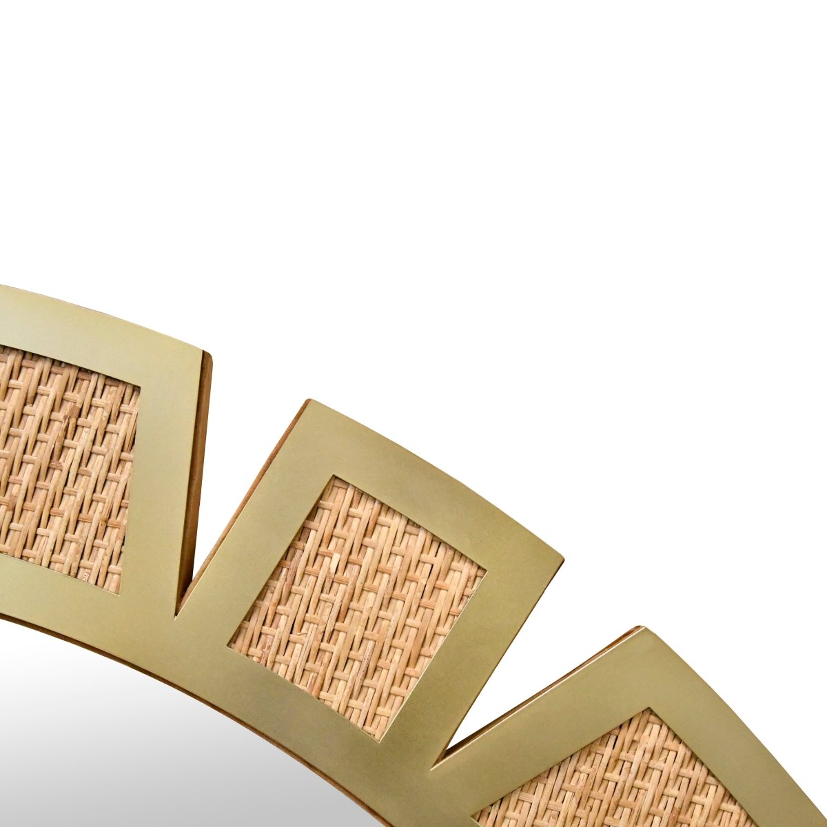 Worlds Away Sunday Round Modern Sunburst Mirror With Framed Rattan with Brass Details. Beautiful wall mirror that's classic and new at the same time. You'll love the shape and the rattan detailing with a bit of brass finish. Perfect in an entryway, a bathroom or in a bedroom.