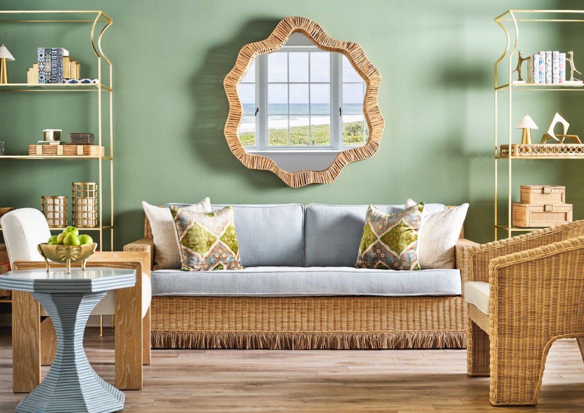 Worlds Away Octavia Light Blue Large Occasiona Table. Octagonal Rattan Reeded Side Table In Painted Light Blue. Dimensions 29.5" H x 36" DIA. Wonderful in an entryway or when used in a living room alongside a chair. Place in a corner with flowers and books. So many uses for this reed-wrapped base table with an octagonal top for style. Made in INDONESIA