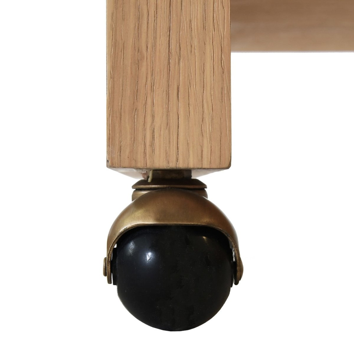 Myer Natural Oak Bar Cart by Worlds Away. Crafted from natural oak, this bar cart features elegant waterfall edges that add a refined and clean architectural detail. Its antique brass rails provide both style and security, keeping bottles and glassware safely in place as you move from room to room. Designed to blend classic craftsmanship with functional modernity, the Myer cart offers ample surface and under-shelf storage to organize your favorite spirits and bar accessories efficiently. Perfect for sophisticated settings, it combines durability with timeless appeal, enhancing your home bar experience.