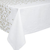 This Domaniale White Tablecloth by Alexandre Turpault is uniquely designed and sophisticated. Inspired by nature and walking trails, the white table linens are decorated with elegant pine cones and leaves printed in natural tones of beige, grey and taupe. The tablecloth also features silver wire twigs and gold embroidery. It is easy to care for–the tablecloth is finished with anti-stain treatment. Versatile and luxurious, the Domaniale Tablecloth is sure to delight at any occasion.