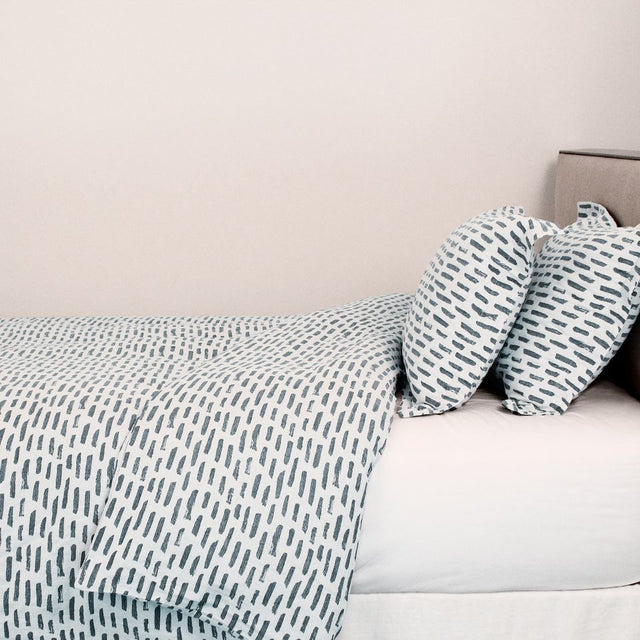 Brushstroke Charcoal Duvet Set by Ann Gish. This duvet cover and shams features an creative and modern pattern with irregular brushstrokes running horizontally. The dark charcoal pattern set against a white background creates a nice contrast that gives this bedding a unique look. Stylish, elegant and great for adding eye-catching pattern to any contemporary bedroom.