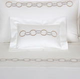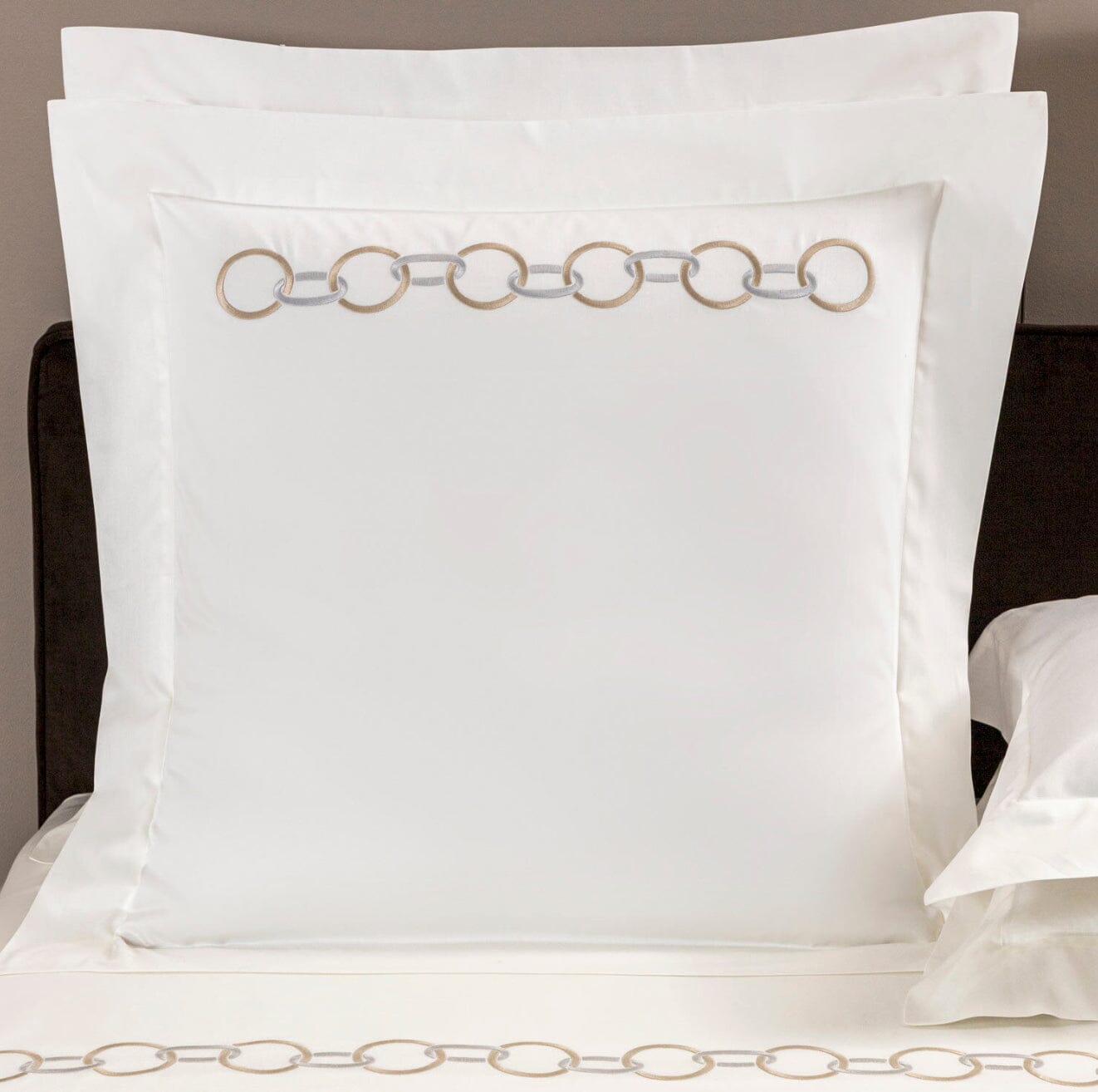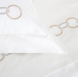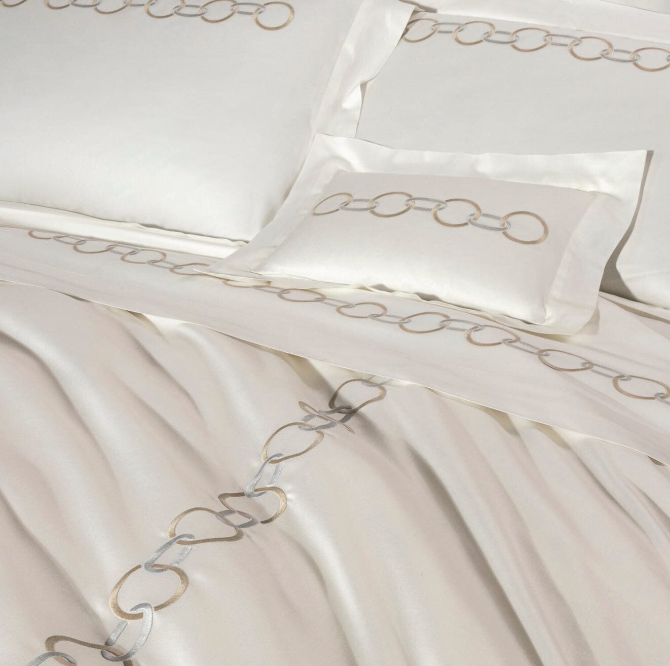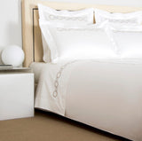 Links Embroidery by Frette. Links Embroidery features an elegant chain design in coordinating hues on soft and silky cotton sateen. Made with an intricately embroidered dual-tone chain design on the top sheet and shams, the Links Embroidered Sheet Set brings elegance to any master or guest bedroom. This sheet set includes a top sheet, two shams, and a bottom sheet in pure long-staple cotton sateen. 100% cotton. Made in Italy. Fitted sheets have elasticized corners and flat sides.