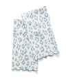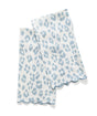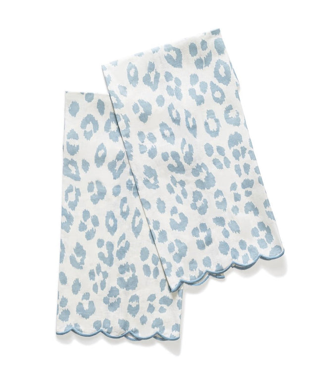 Iconic Leopard Sky Guest Towels by Matouk Schumacher. Introduced in the 1970s, Schumacher's Iconic Leopard is alluring, distinctive, and endlessly chic. Printed on Matouk's classic linen for a wonderfully stylish powder room statement towel. Function meets fashion. Sky Blue on natural white linen with Sky piping.