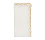 Arches Napkin in White & Gold Set of 4 by Kim Seybert. The Arches linen napkin offers a contemporary update to a standard white linen napkin, featuring a thick embroidered geometric edge accented by delicate pick-stitching. This harmonious border beautifully frames the entire napkin. Gold embroidery adds a glow to the crisp white linen, creating a luminosity that enhances the napkin's charm. Its versatile design seamlessly transitions from formal dining to more casual settings. Materials: 100% Linen