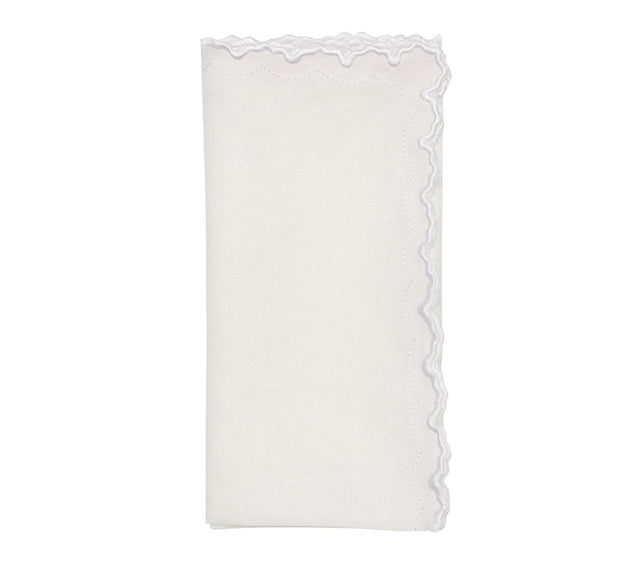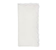 Arches Napkin in White Set of 4 by Kim Seybert. The Arches linen napkin offers a contemporary update to a standard white linen napkin, featuring a thick embroidered geometric edge accented by delicate pick-stitching. This harmonious border beautifully frames the entire napkin. Monochromatic white embroidery blends beautifully into the crisp white linen, creating a delicate contrast of texture that enhances the napkin's charm. Its versatile design seamlessly transitions from formal dining to more casual settings. Materials: 100% Linen