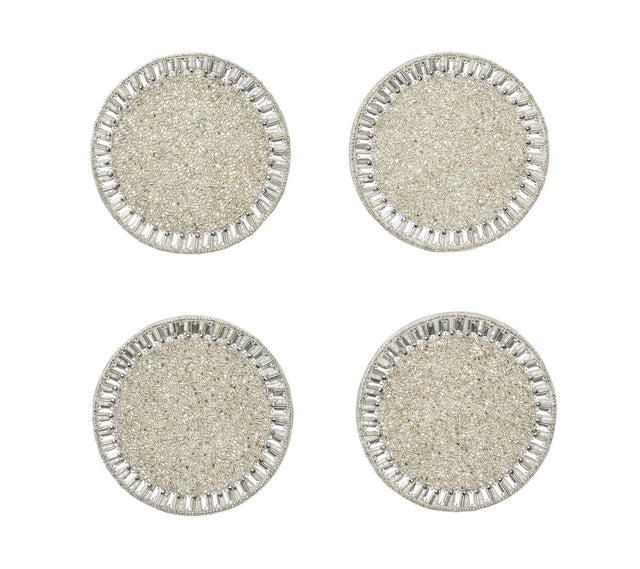Bevel Coasters in Silver & Crystal Set of 4 in a Gift Bag by Kim Seybert. Mimicking baguette stones that are typically found on jewelry; the graceful Bevel Coasters exude understated elegance. Glass and acrylic rose gold beads are arranged in a pave pattern on the Bevel Coasters, creating a halo effect. Materials: 80% Glass Beads, 20% Plastic Beads on Cotton Backing