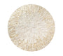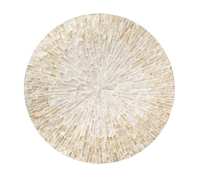 Byzantine Placemat in Ivory & Gold Set of 4 by Kim Seybert. Inspired by mosaic formations, the Byzantine placemat is made from hand-cut capiz shell tiles arranged in a circular pattern. It is on a wood packing and sealed with resin. It comes in two colors: Ivory & Gold or Gray It is a versatile placemat and will work on many different table setting themes. Materials: 100% Capiz Shells on MDF Backing
