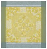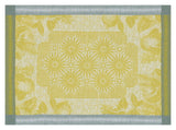 Jardin D'Orient Table Linens draw inspiration from the Oriental Gardens of Marrakesh. Collection features tablecloths, placemats, napkins and runners with intricate designs and a bright yellow and green palette.