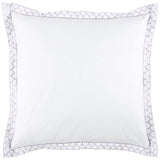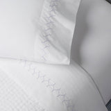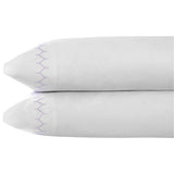 Stitched Lavender Sheet Sets by John Robshaw. Sheets, Pillowcases and Euro Sham made from crisp and super soft cotton percale. The white bedding features a graphic zig-zag lightest purple hand embroidered design. Complement your lilac, lavender or soft color bedding.