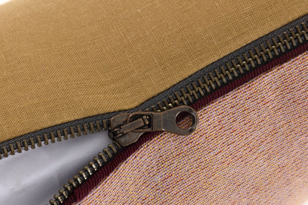 A hot-air balloon from yesteryear, made of striped silk canvas and held together by braided cords. Cushion covers, front in tapestry, back in linen.