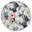 A rich and dramatic round floral rug featuring large scale peonies and foliage in tones of zinc, blush, sage and charcoal. Digitally printed onto a dense short polyamide pile, this quality rug displays intense detail and color.