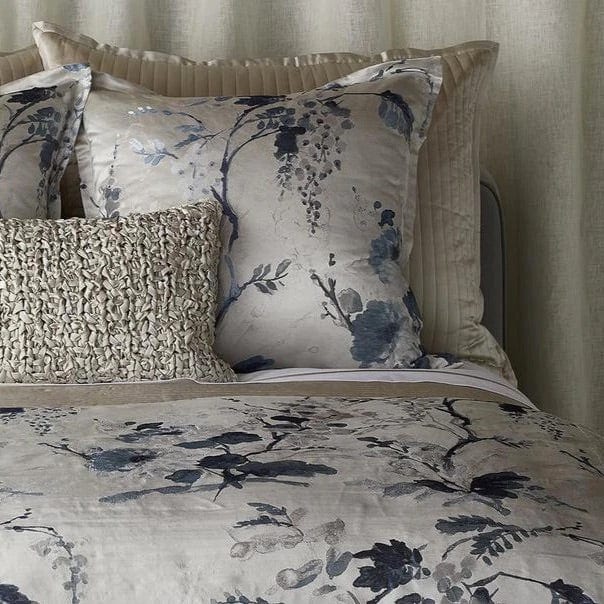 This Jardin Fleur Silver Bedding by Ann Gish puts a fresh and contemporary take on a traditional pattern. The duvet cover and shams have a gorgeous floral design jacquard woven in cool shades of azure and neutrals. The flowers are set against a silver background that gives them a modern and fashion-forward look.