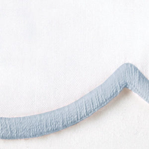 Light Blue Embroidery on White Cotton Percale. Dakota Scallop Bedding by Matouk is a new, updated classic. Small scallop is reimagined on crisp 520 thread count Ceylon sheeting. Dakota's timeless scallop adds a soft, colorful edge that creates a bedroom filled with effortless charm. Soft, durable and lovely Duvet Covers, Sheets, Pillowcases and Pillow Shams with blue detail. The style is allover white with just a hint of color on the delicate scalloped edge.