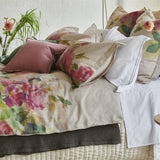 Designers Guild Thelma's Garden Fuchsia Bedding. Reminiscent of an English country garden, this pure linen floral bedding displays bouquets of painterly wild roses and peonies in soft water colour tones. Digitally printed onto a luxurious natural linen with plain linen reverse. Shams finished with a smart linen color trim detail. OEKO-TEX Standard 100 approved for added confidence.