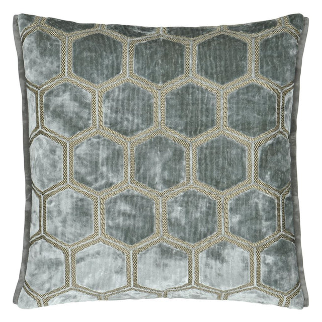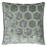 Designers Guild Manipur Silver Decorative Pillow. This stylish, cut velvet, square decorative pillow in cool silver Manipur, features a bold scale, hexagonal geometric with a unique patterned effect in the ground. Elegant and sophisticated, this luxurious decorative pillow is finished with a Kumana reverse in cool marble and a zinc trim.