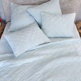 Sagana Light Indigo Euro Sham by John Robshaw. Quilted yet soft and relaxed. Add a casual yet refined and elegant look and feel to your room. The cozy bedding features a simple stripe design in a light indigo that is designed to work well with any of Robshaw's fun prints. The bed linens are made from cotton slub that is super soft to the touch with a classic diamond quilted design. Perfect for layering.