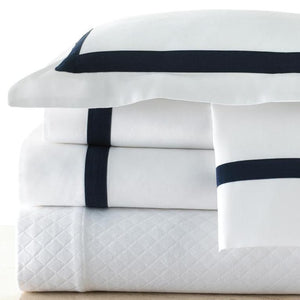 Sedona I Percale Bedding by Legacy Home. Timeless and luxurious cotton percale duvet cover, sheets, shams and pillowcases with a stylish and timeless border detail. The bed linens are available in White, Antique White and Ivory.